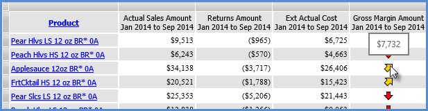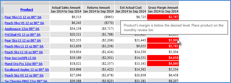 IIf([Measures].[Data23 (Gross Margin Amount Jan 2014 to Sep 2014)] < 5000, "Product's margin is below the desired level. Place product on the monthly review list." , "Margin is within acceptable range. No action is needed.")