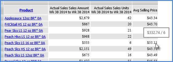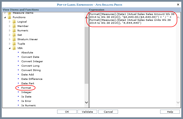 This expression displays the value of a sales amount measure item followed by a division sign and the value of a sales units measure item. The VBA Format function is used to control the display format of the values in the pop-up label. The pop-up label is meant to show the values behind a calculated measure item’s results.