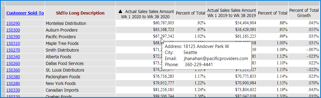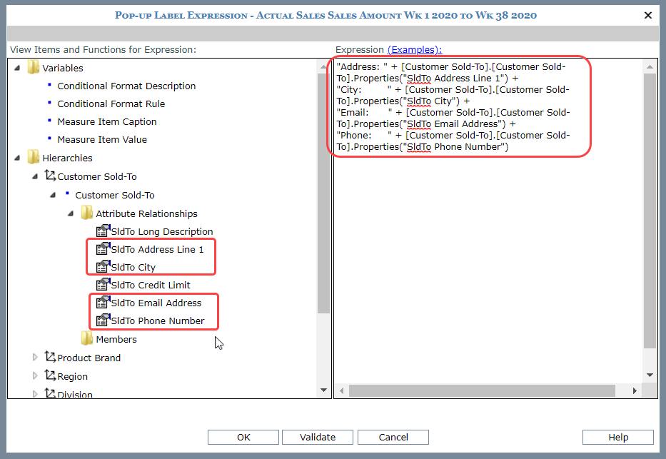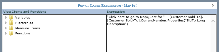 This expression uses static text in combination with information from the view. The pop-up label will vary as you click on each Map It! measure item value based on corresponding Customer Sold-To member information.