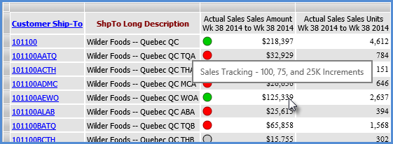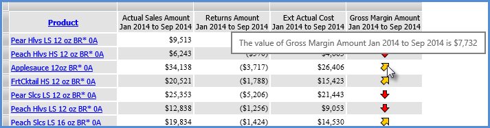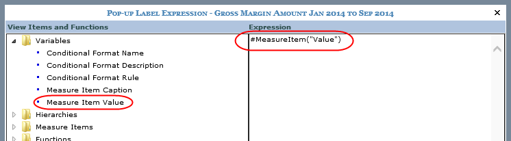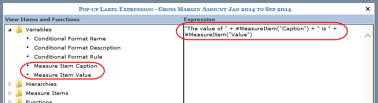 You can define pop-up labels for individual measure items using the Pop-up Label Expression property. You can include static text, variables, or a combination. When you specify a pop-up label, it takes precedence over other properties that would normally impact what displays in pop-up label text. If a pop-up label is defined, then it will display as the pop-up label text. If no pop-up label is defined but a hyperlink exists on the measure item, then the hyperlink displays in the pop-up label. If no pop-up label or hyperlink is defined but there is a drilldown view defined for the Measure Items axis, then the pop-up label will be the text ‘Drill To” followed by the name of the drilldown view.