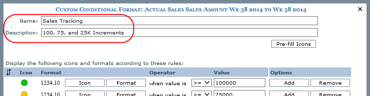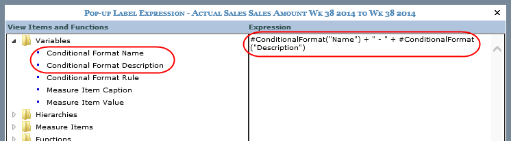 This expression uses two of the Conditional Format variables separated by static text (a dash mark). The pop-up label is for a measure item that has a conditional format defined for it.