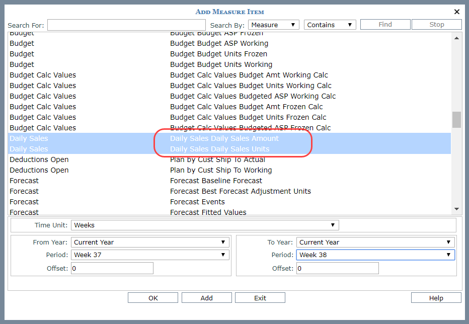 The two measure items in the following view were created from two Daily Sales measures using the Add Measure Item window.