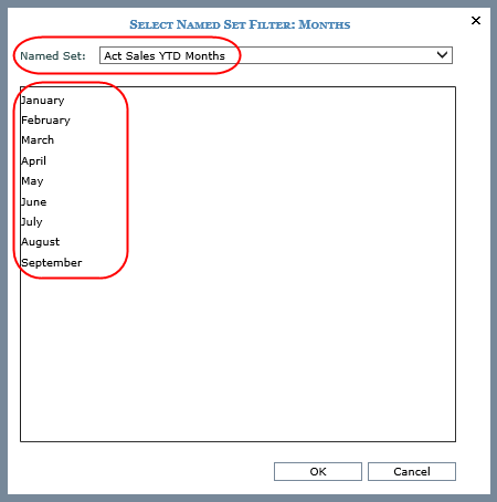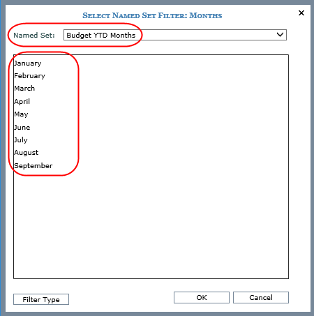 The Select Named Set Filter window displayed, and the Budget YTD Months named set was selected. The window displayed the members in the named set. Then, OK was clicked to apply the filter.