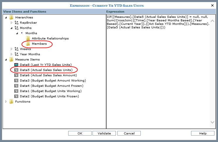 This expression uses the Act Sales YTD Months named set and the Actual Sales Sales Units measure item, which is part of the view definition but hidden from display. The expression has been optimized to check whether or not sales units data exists. The expression will be executed only for cases where there is data. Running the expression without this check could be time consuming.