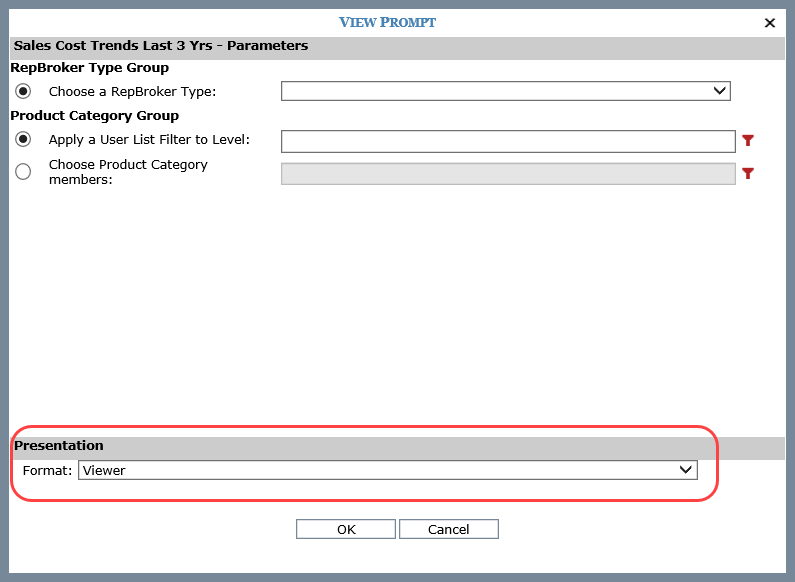 Note: If there aren’t any other parameters defined for the view, then only the Presentation section will display in the View Prompt window.