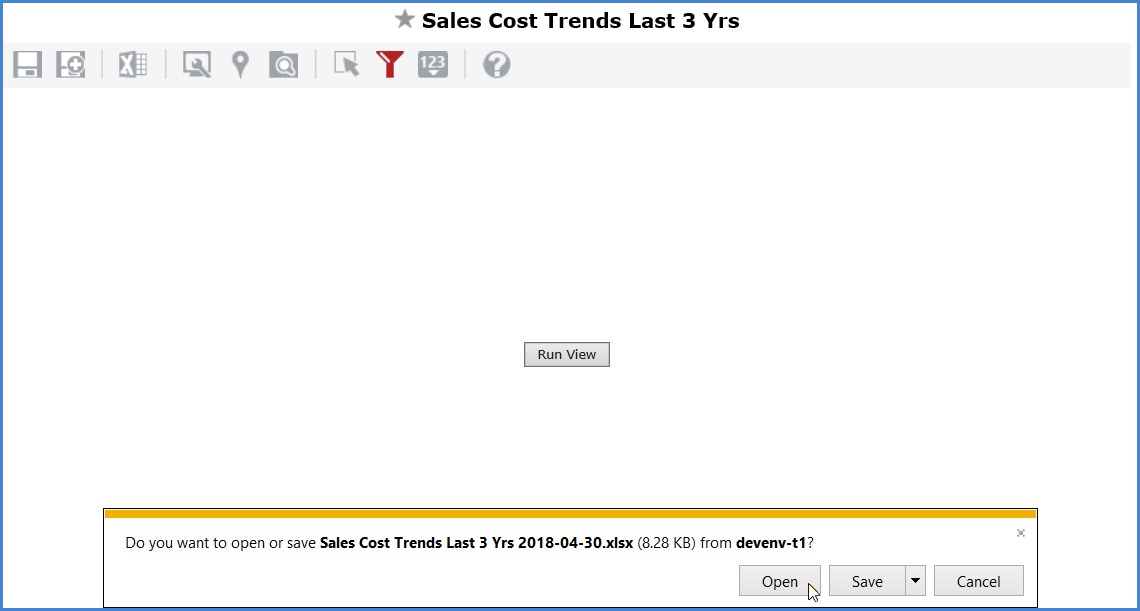 If the Viewer option is selected, the view grid will display in the Stratum.Viewer interface. If the Excel option is selected, the View Definition page will display in the background while a File Download window or browser message opens. Users can open the file or save it to a specified location.
