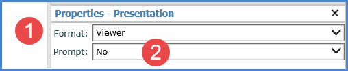 Prompt – Use to set up the view such that users will be prompted to choose the presentation format for displaying view results each time they run the view. This is done by setting the Prompt property to Yes. The View Prompt window will display each time users run the view, and they can use the Presentation section in that window to choose the presentation format. If the option is No, the view will run in the format you selected for the Format property without any prompt. |