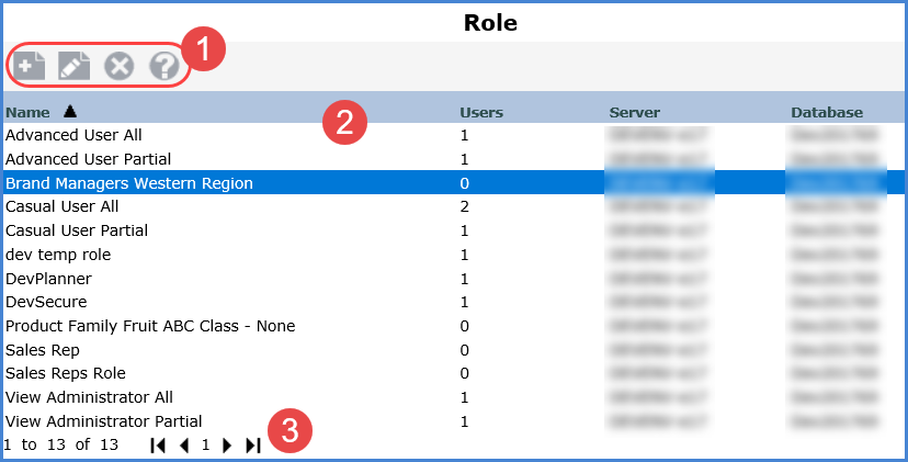 Paging Controls - Use the paging arrows and links to move between pages of roles. Controls are active only when there are multiple pages of roles. Note: For all windows that display lists (views, user lists, etc), there is a single administrative setting on the Application window that controls how many items display per page in a list. |