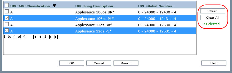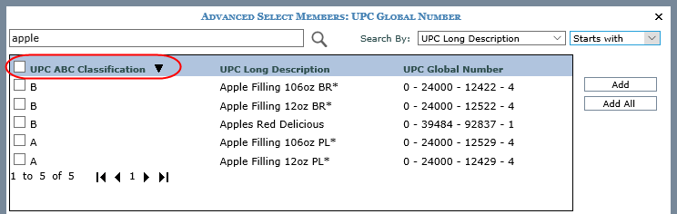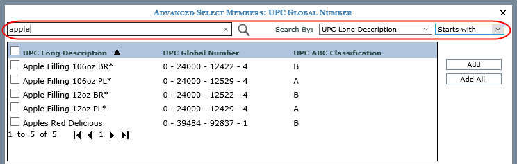 In the following example, we searched for UPC long descriptions starting with “apple” and 5 items were retrieved.
