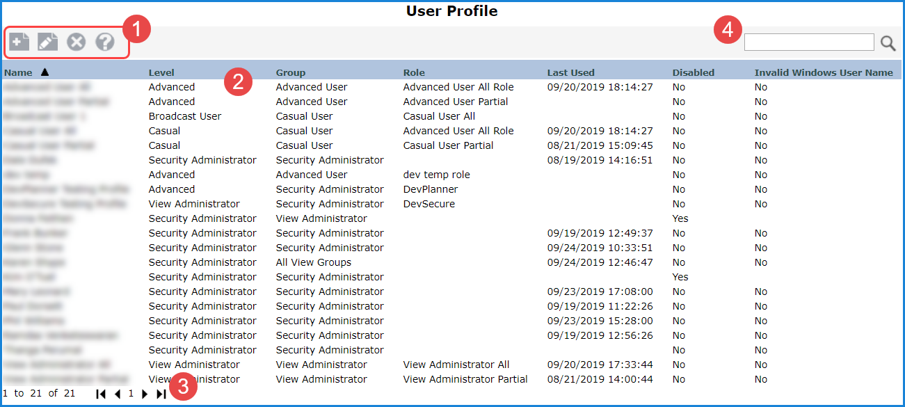 Paging Controls - Use the paging arrows and links to move between pages of user profiles. Controls are active only when there are multiple pages of user profiles. Note: For all windows that display lists (views, user lists, etc.), there is a single administrative setting on the Application window that controls how many items display per page in a list. |
