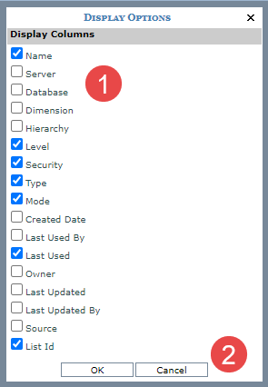 Display Columns - Select or deselect columns to control the information that displays on the User List window. The window defaults to show list name, level, whether or not the list is a security list (Yes/No), the type (global or personal), the mode (static or dynamic), the last used date, and list Id. |