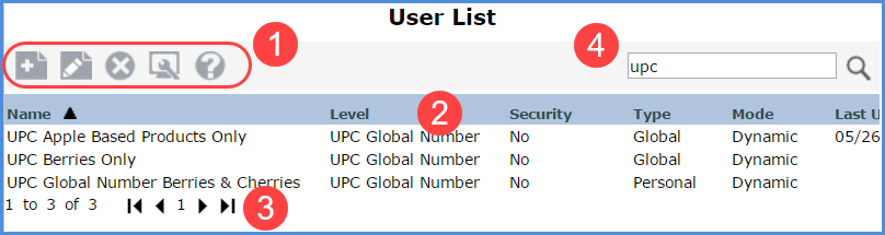 Paging Controls - Use the paging arrows and links to move between pages of lists. Controls are active only when there are multiple pages of lists. Note: For all windows that display lists (views, user lists, etc), there is a single administrative setting on the Application window that controls how many items display per page in a list. |
