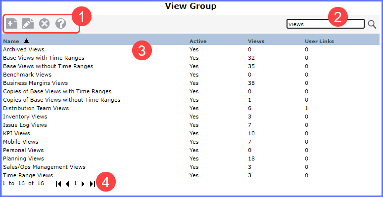 Paging Controls - Use the paging arrows and links to move between pages of groups. Controls are active only when there are multiple pages of groups. Note: For all windows that display lists (views, user lists, etc.), there is a single administrative setting on the Application window that controls how many items display per page in a list. |