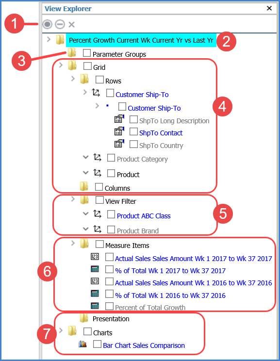 Grid folder – The folders for Rows, Columns, View Filters, and Measure Items are organized under the Grid folder. From the Grid folder, you can access a Grid Properties window which determines if the grid is visible and if paging is enabled for the grid display. Selecting the checkbox for this folder is a shortcut to selecting all items in the view. Rows and Columns folders – All of the included levels and attribute relationships, grouped by hierarchy, display in their applicable Rows and Columns folders. Selecting the checkbox for a folder is a shortcut to selecting all items in that section. You can move hierarchies along with their levels and attribute relationships between the Rows, Columns, or View Filter by dragging and dropping them within view explorer or into the grid from view explorer. Properties windows exist for hierarchies, levels, and attribute relationships in these folders. Use them to hide or show items, set up filters or sorting, control the display of totals and All Others value defaults, etc.