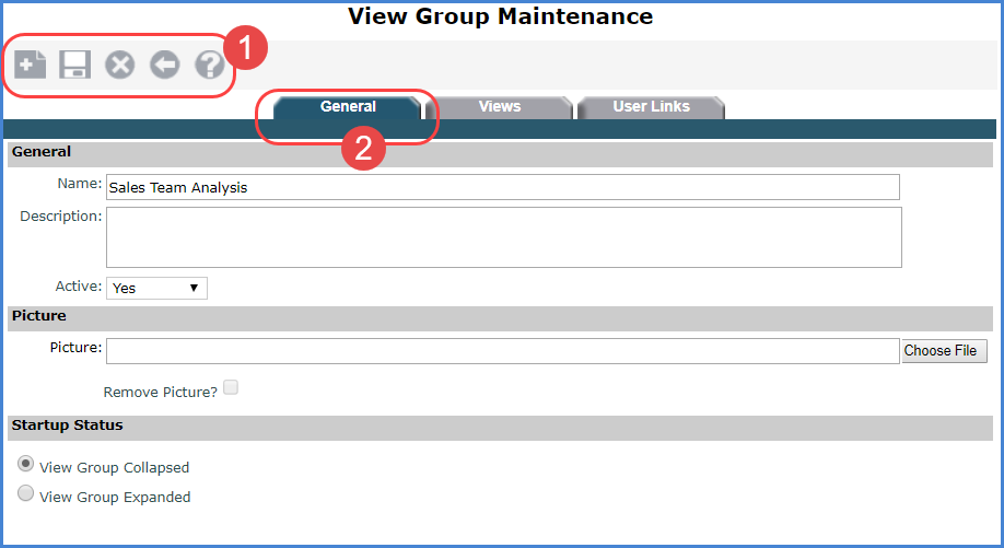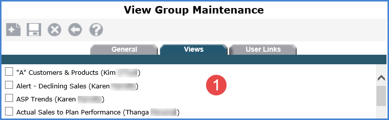 Views - Use this list to add views to the group or remove views. The icon next to the view name indicates whether the view is global, shared, or personal. The name of the person owns the view displays after the view name. Views are listed in alphabetical order. Note: The tab will be blank if no views exist. |