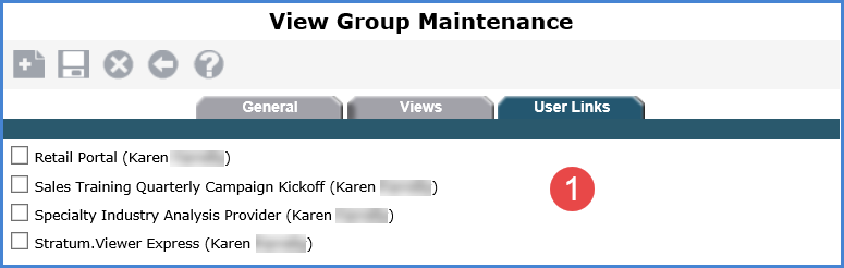 User Links - Use this list to add user links to the group or remove links. The icon next to the link name indicates whether the link is global or personal, and the name of the person who last saved the link displays after the link name. Note: The tab will be blank if no links exist. |