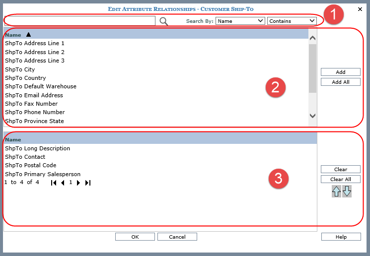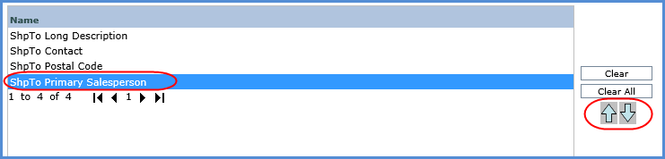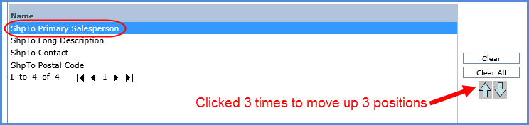 In the example below, the ShipTo Primary Salesperson is moved to the first position by clicking the move up arrow button three times to move it up three positions.
