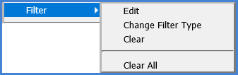 Filter - Filter options are Edit, Change Filter Type, Clear, and Clear All. Change Filter Type opens a window where you can select the type of filter to set up or change. By default, a new filter you create from the Filter > Edit option is a list of members from the level with which you are working.