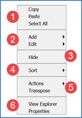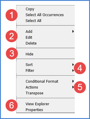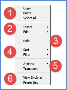 Right-click objects in views to display available functionality for them such as inserting measure items, transposing the grid, filtering objects in the grid, and so forth. Many of the functions can also be controlled through view explorer and the Properties window, giving you several ways to make changes. Options on pop-up menus vary by user. Your user profile level determines which options are available to you. The menus in these examples are for a user with an advanced level of access. Menus are displayed in alphabetical order.