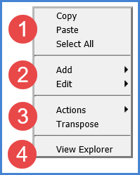 Right-click within the grid to display actions that you can take such as transposing the rows, columns, and measure items.