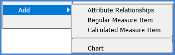 Add - The sub menu has options for adding Attribute Relationships, Regular Measure Items, Calculated Measure Items, and Charts. Windows for adding the selected type of item will display once you make your selection from this sub menu.