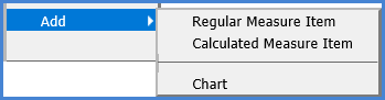 Add - The sub menu has options for adding Regular Measure Items, Calculated Measure Items, and Charts. Windows for adding the selected type of item will display once you make your selection from this sub menu.