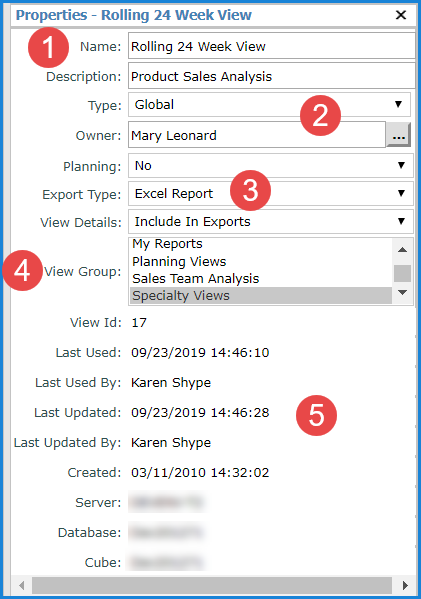 Planning – If you intend to set up this view as a planning view for users, the Planning property must be set to Yes. Once all other requirements for planning are met in the view, planning icons will display next to measure items that are update enabled for the users. Export Type – This property determines the format of Excel exports for the active view. The Excel Report format will export all data and charts in the view, using the formatting that you normally see in the view. The Excel Data option will export the view data only without any special formatting applied to it. View Details – This property determines if the View Details tab or section will appear in exported and emailed views. View Details show as a tab in exported files and a section in emailed views. Details are included by default and show things like counts for rows and columns, filtering details, and the view name. Choose the Exclude From Exports option if you don’t want the view details included in the exported and emailed outputs for this view. |