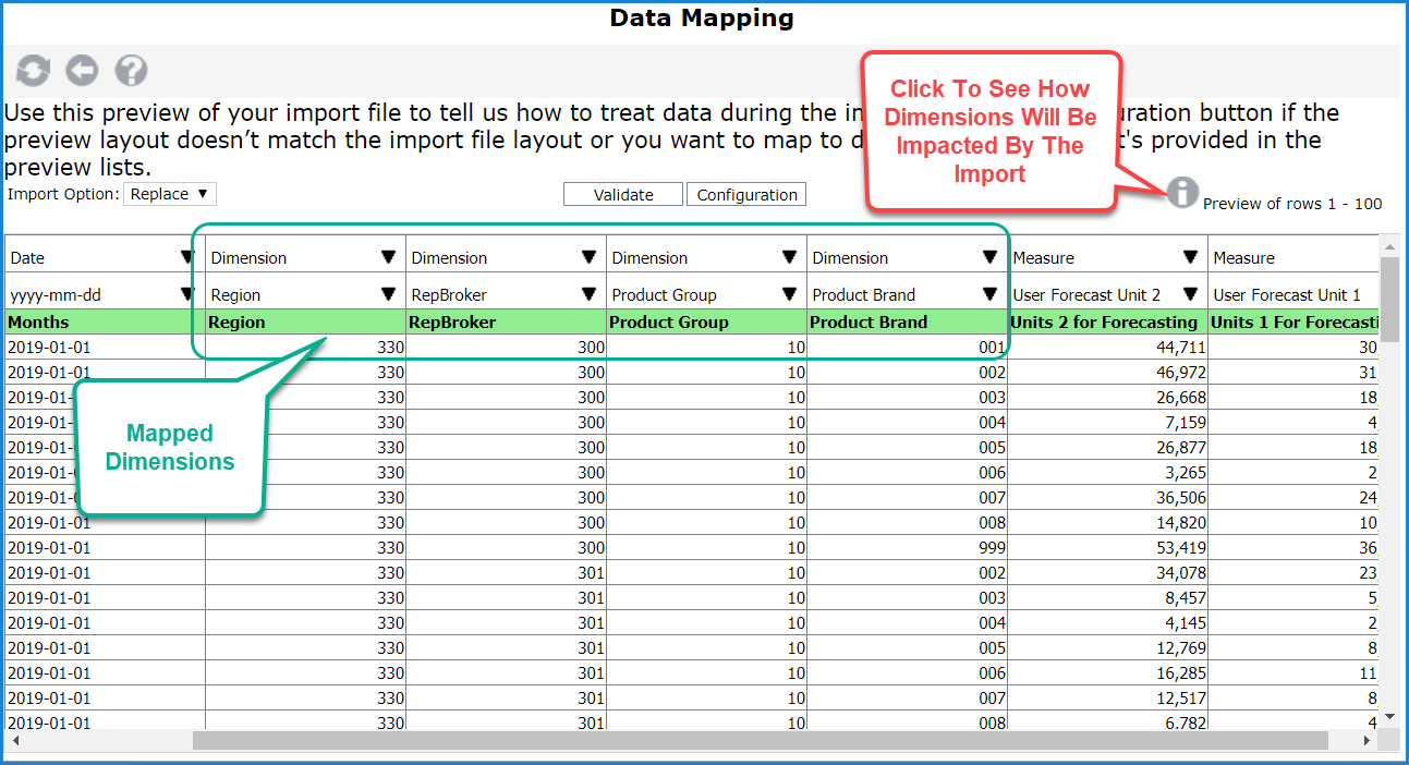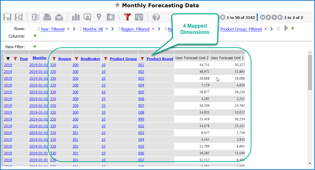 Here’s the view when mapped dimensions are on display. The Region, RepBroker, Product Group and Product Brand data came from the import file.