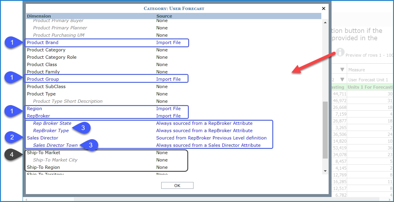 4. Ship-To Market is one of many dimensions that have a None designation, meaning import data cannot be derived from the import file, previous level relationship, or from a parent dimension’s attribute. Therefore, all data will only show up for its default value.