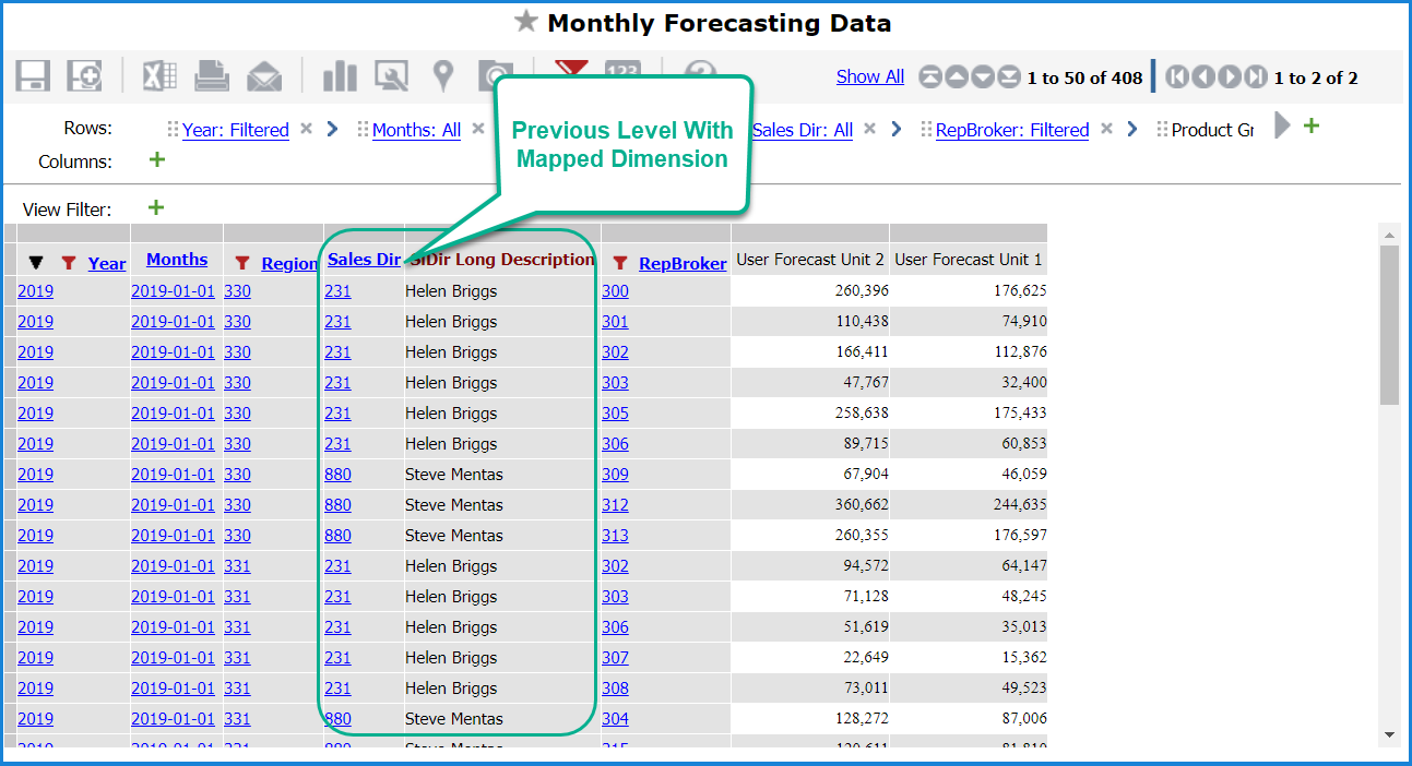 Here’s the view when the Sales Director dimension is on display. The Sales Director data was created from the Rep Broker | Sales Directory previous level information.