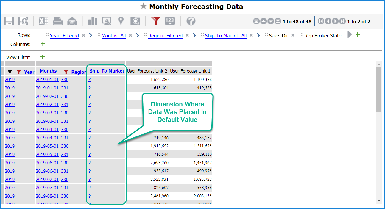 And here’s a view with the Ship-To Market dimension on display in rows. That dimension wasn’t in the import file and Data Import couldn’t derive values from any previous level associations to other dimensions. Data only shows for the Ship-To Market’s “?” default value.