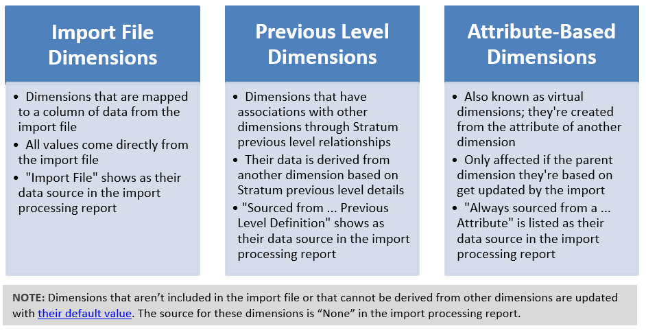 The way data gets imported to the various dimensions in your Stratum environment is influenced by a few things, including what dimension values were in the import file and what dimensions you mapped to during import set up. Read on to learn about what you can expect to see in Stratum when you look at your imported data.