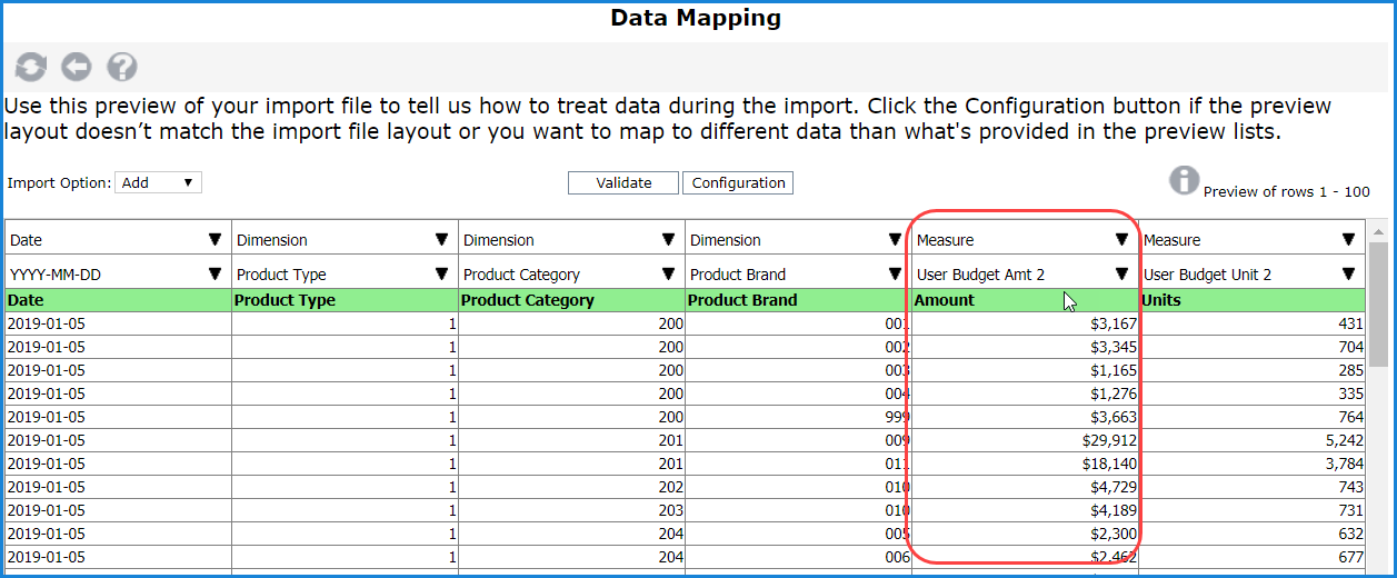 In the following example, two columns were mapped to User Budget Unit 2. Changing one of the column mappings to a different measure will correct the issue.