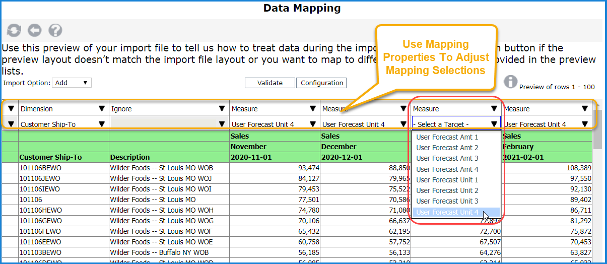 You can change mapping selections using controls in the top two rows of the Data Mapping preview.