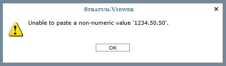 A warning message will display if none of the values for a paste are considered valid. For example, a warning message would display if you attempted to paste a value of “Abc”, 1234.50.50, or - - 1234.50.