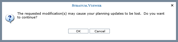 Modifications such as drilling up or down in a view, changing a sort, changing a filter, adding or deleting measure items or levels or attribute relationships, and drag and drop are changes that will refresh the grid. If you make such changes while there are unprocessed planning updates in the view, a warning message will display prior to the grid refresh. The message will tell you that updates will be lost and give you the opportunity to cancel your modifications.