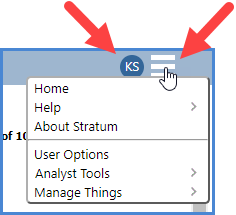 Using the following options from the top panel menu: Home, About Stratum, User Options, any Manage Things option, and any Analyst Tools option.
