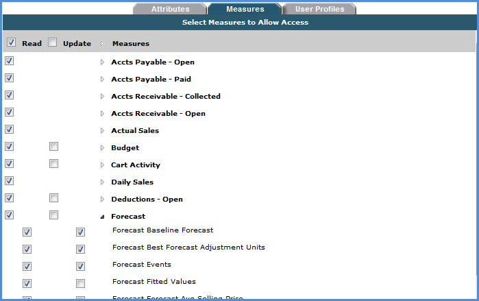 In the Role Maintenance window, use the Update checkboxes on the Measures tab to give Update authority to the measures.If an Update checkbox does not exist or is disabled for a Category, see Why isn’t there an Update Checkbox Available for a Role’s Category? or see Why is an Update Checkbox Disabled for a Role’s Category?.