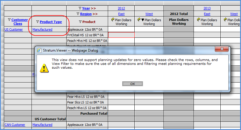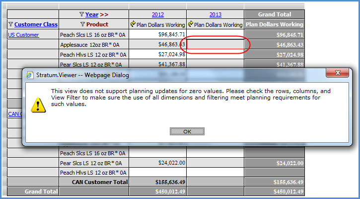 In the following view, one of the hierarchies for the measure item’s Category isn’t visible. The missing hierarchy is Region. Attempting to change zero or blank values in the detail cells would result in the following message.